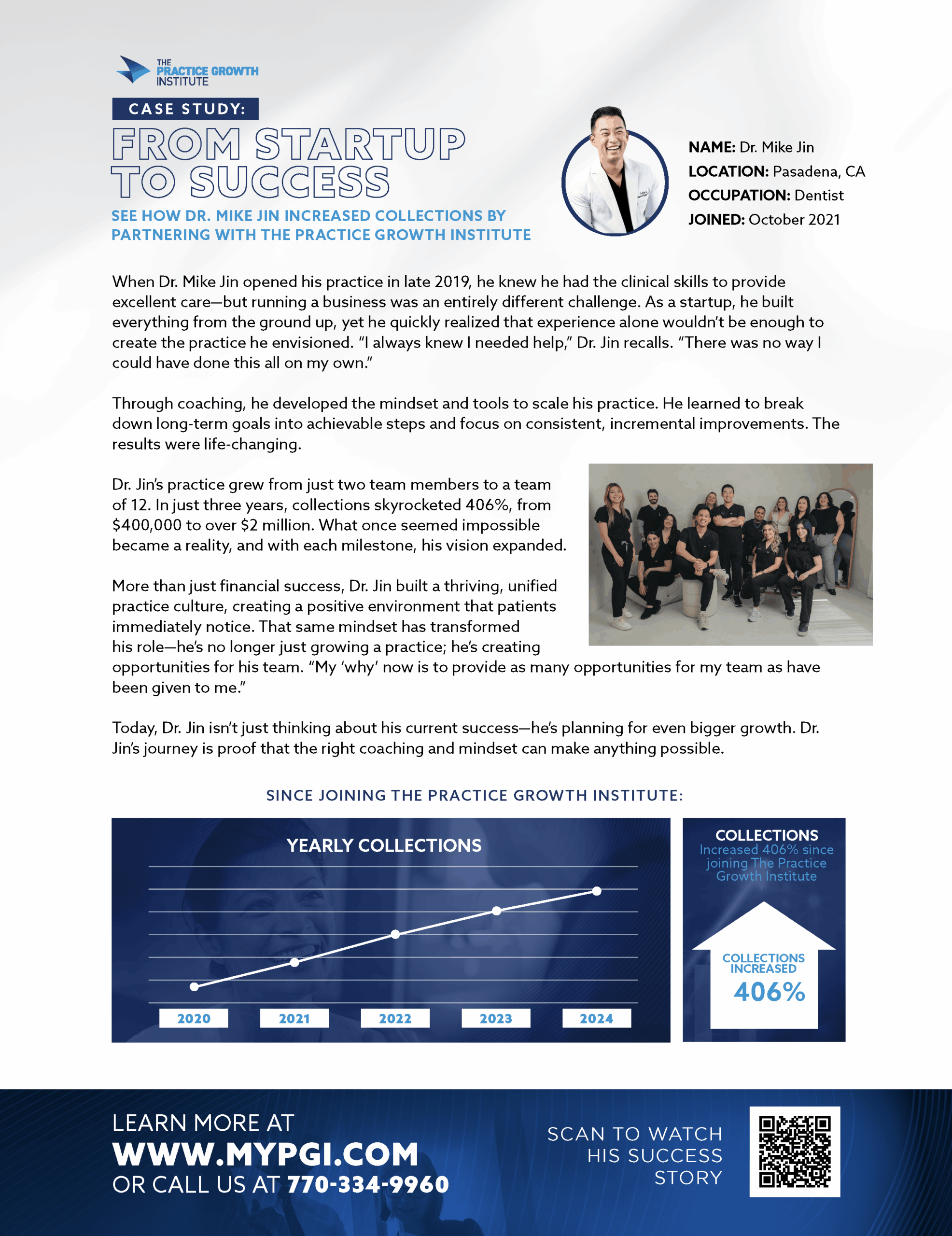 As a startup, Dr. Mike Jin built his practice from the ground up, yet quickly realized that experience alone wouldn’t be enough to create the practice he envisioned. See how Dr. Jin increased collections by partnering with The Practice Growth Institute.